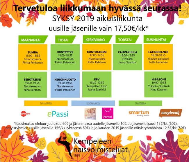 Sekä aikuisten että lasten syyskausi alkaa 19.8.2019. Aikuisten tunneilla on ilmainen tutustumisviikko eli voit käydä testaamassa vaikka jokaisen tunnin! Huomenna aloitamme klo 18 Nuorisoseuralla zumba®:lla ja tehotreenillä, jossa käytetään käsipainoja ja gymstickejä. Seuralla on hyvä määrä välineitä lainaksi. Tarvitset mukaasi vain oman jumppa-alustan. Tervetuloa starttaamaan kausi kanssamme!