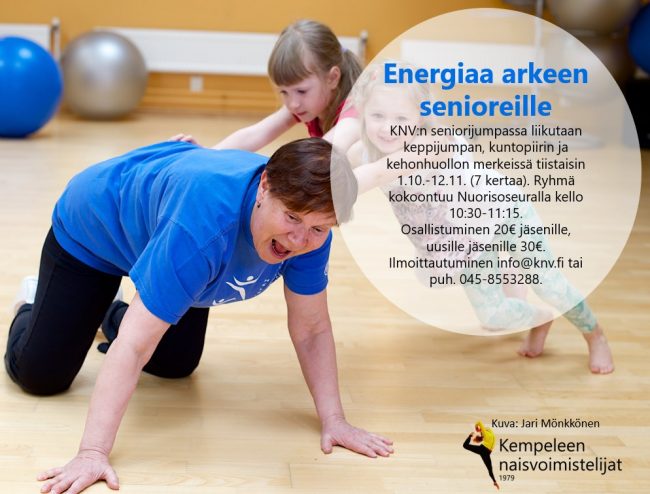 Järjestämme senioreille sopivan jumpan tiistai-aamuisin klo 10:30-11:15 Kempeleen Nuorisoseuralla. 45 min. jumppa pidetään ajalla 1.10.-12.11.2019, yhteensä kokoonnumme 7 kertaa. Kauden aikana pidämme keppijumppaa, kuntopiiriä ja kehonhuoltoa. Tunti sopii kaiken kuntoisille. Ota mukaan oma jumppa-alusta lattialla tehtäviä liikkeitä varten. Ohjaajana toimii Jaana Saarikivi. Kurssin hinta on 20€ Knv:n jäsenille, uusille jäsenille 30€. Ilmoittautumiset tai puh.…